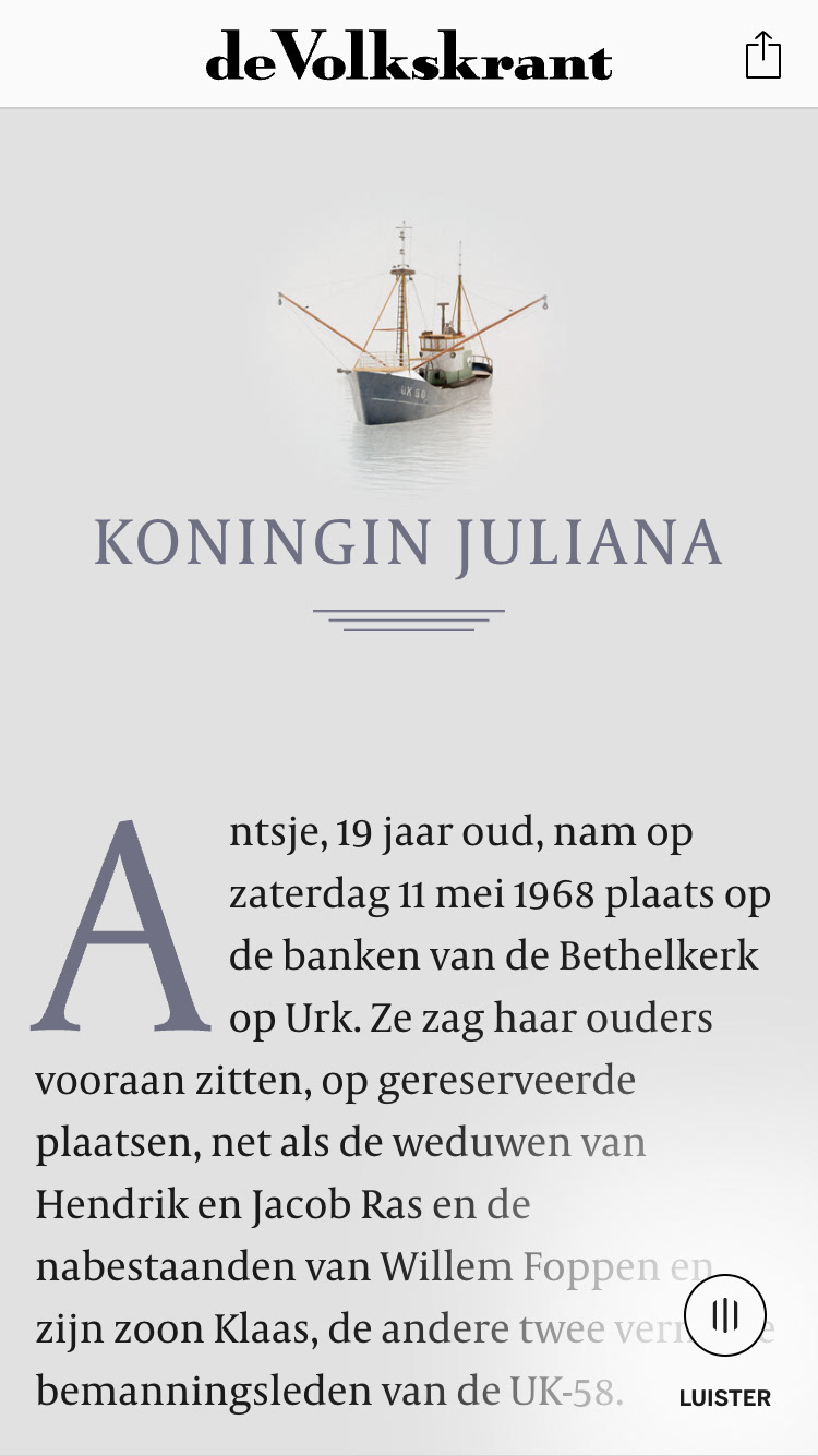 Using the 3D model, I also made small mini icons of the ship to accompany the story as an illustration above every chapter. The story also featured a "live listening" function which allowed readers to switch between reading and listening to the author reading the story aloud. The development of this feature and the visual design for the article was done by Adriaan van der Ploeg and Martijn Eerens.