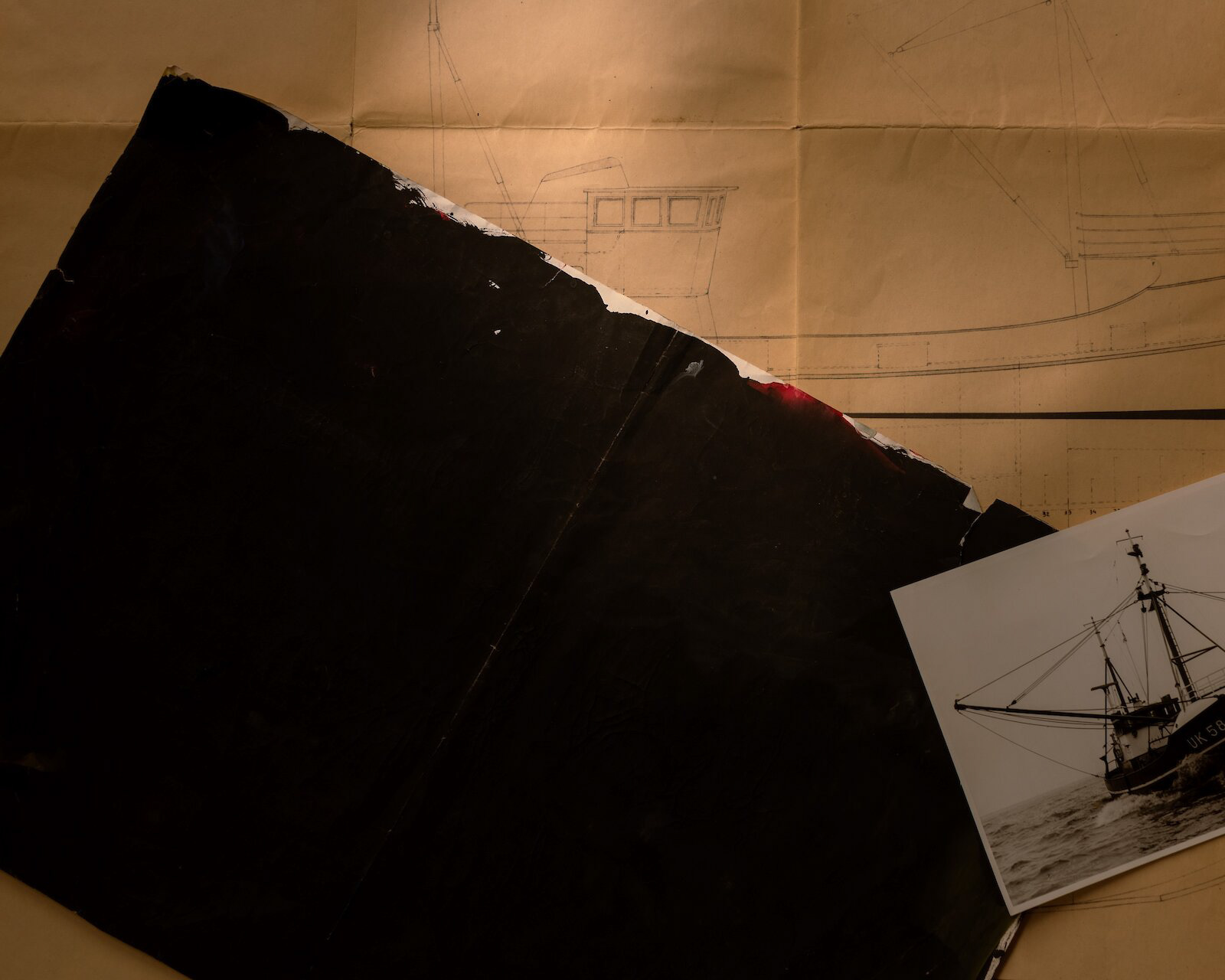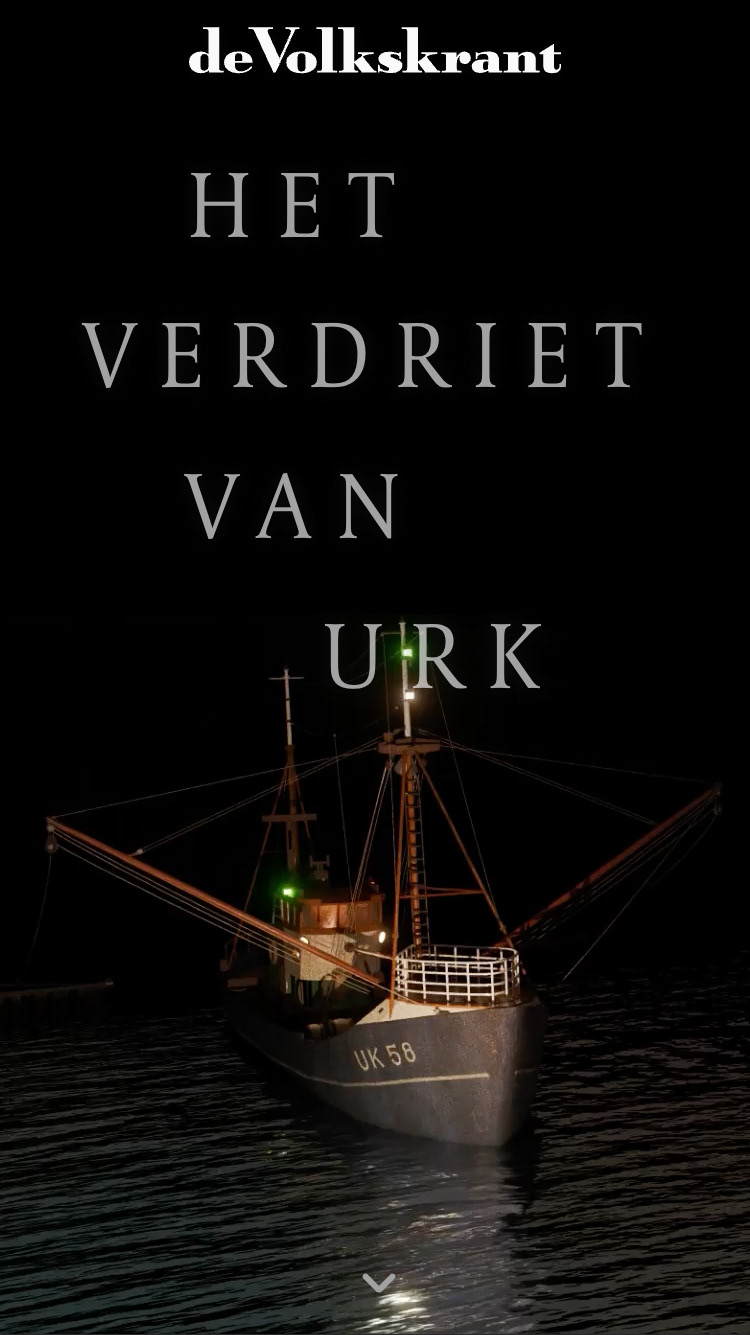 The article featured the personal stories of several family members of the men who died on board the UK-58. The article begins with the story of the son of one of the fishermen, who was 5 years old at the time. At school the next week he was asked by his teacher to make a painting, and he spent the art period smearing black paint over the entire paper. He had kept the painting his whole life, and we show a photo of it in the article. I also designed an artistic impression of black paint in the introduction, which is smeared across the screen as the reader begins the story.
