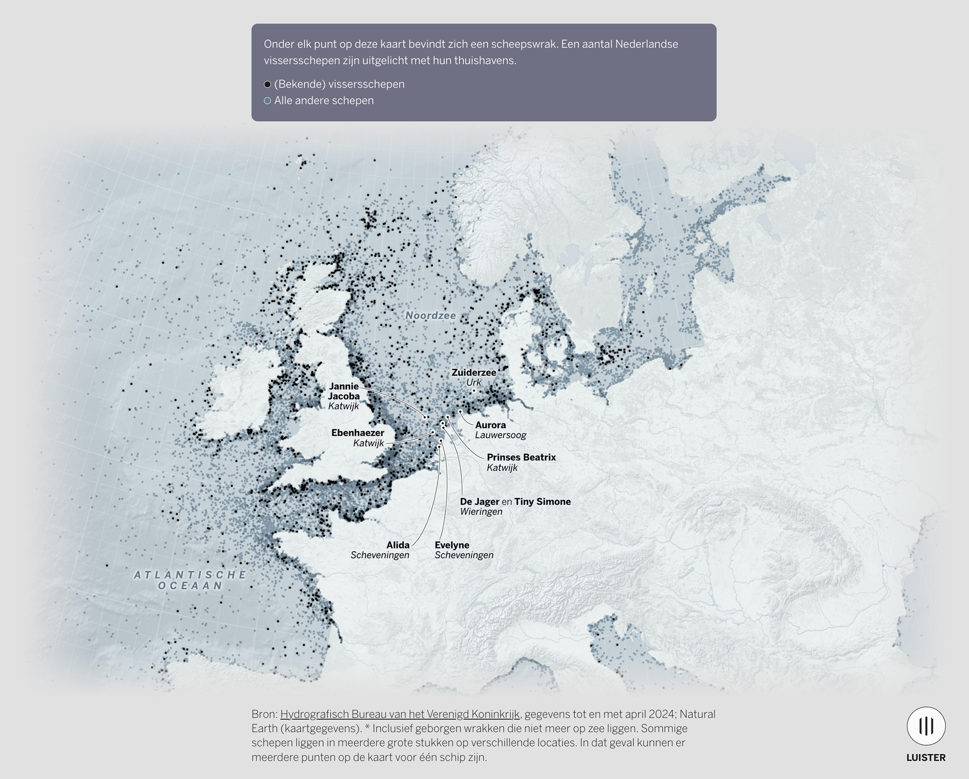 For historical context, I also made a map of every known shipwreck in the North Sea area, highlighting similar Dutch ships that had also sunk nearby. The black shipwrecks highlighted in the map are fishing ships.