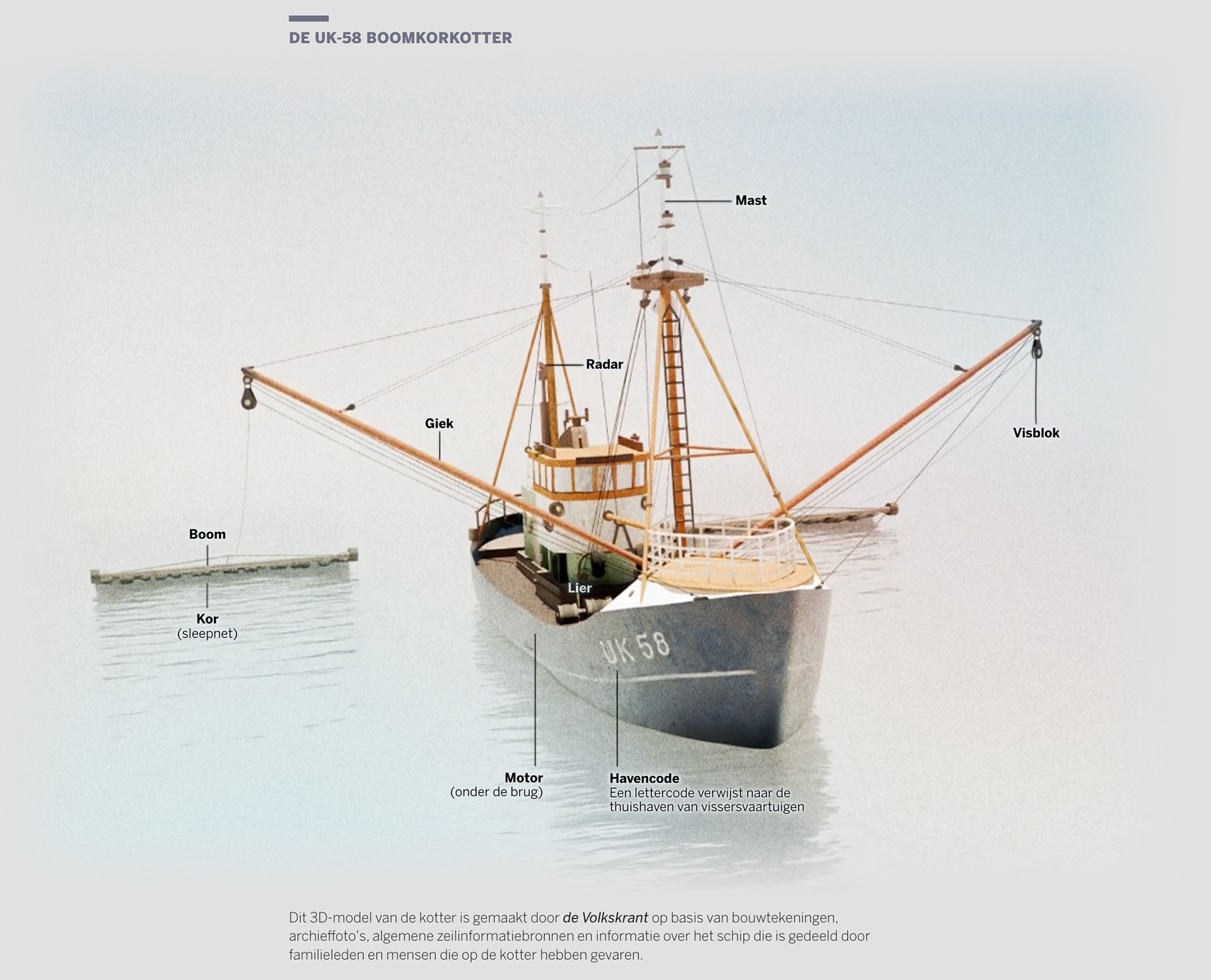 For an article about a sunken fishing ship off the coast of the North Sea, I made a 3D model of the fisherman's ship UK-58 for the Dutch newspaper de Volkskrant.