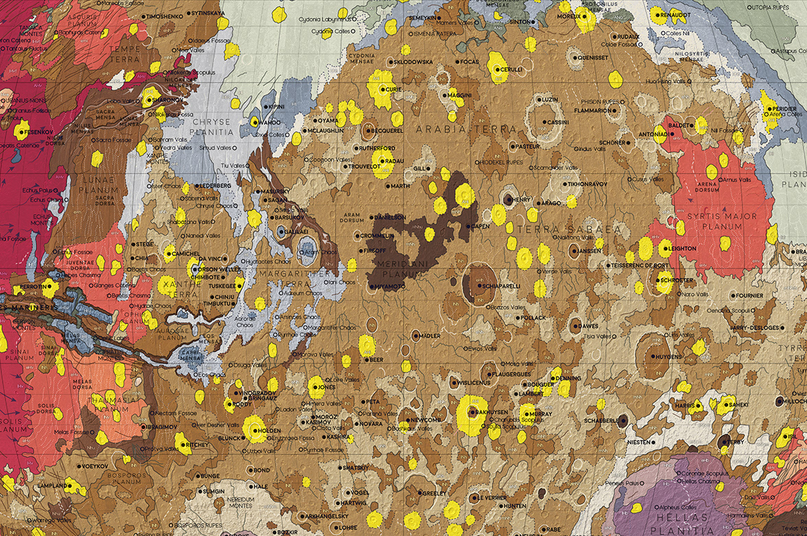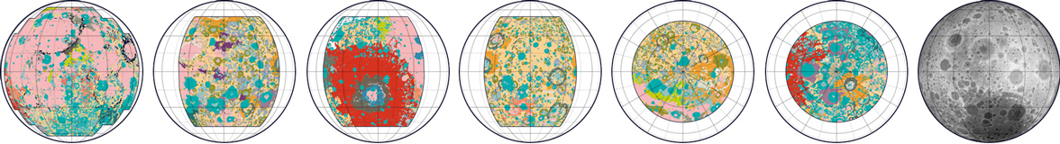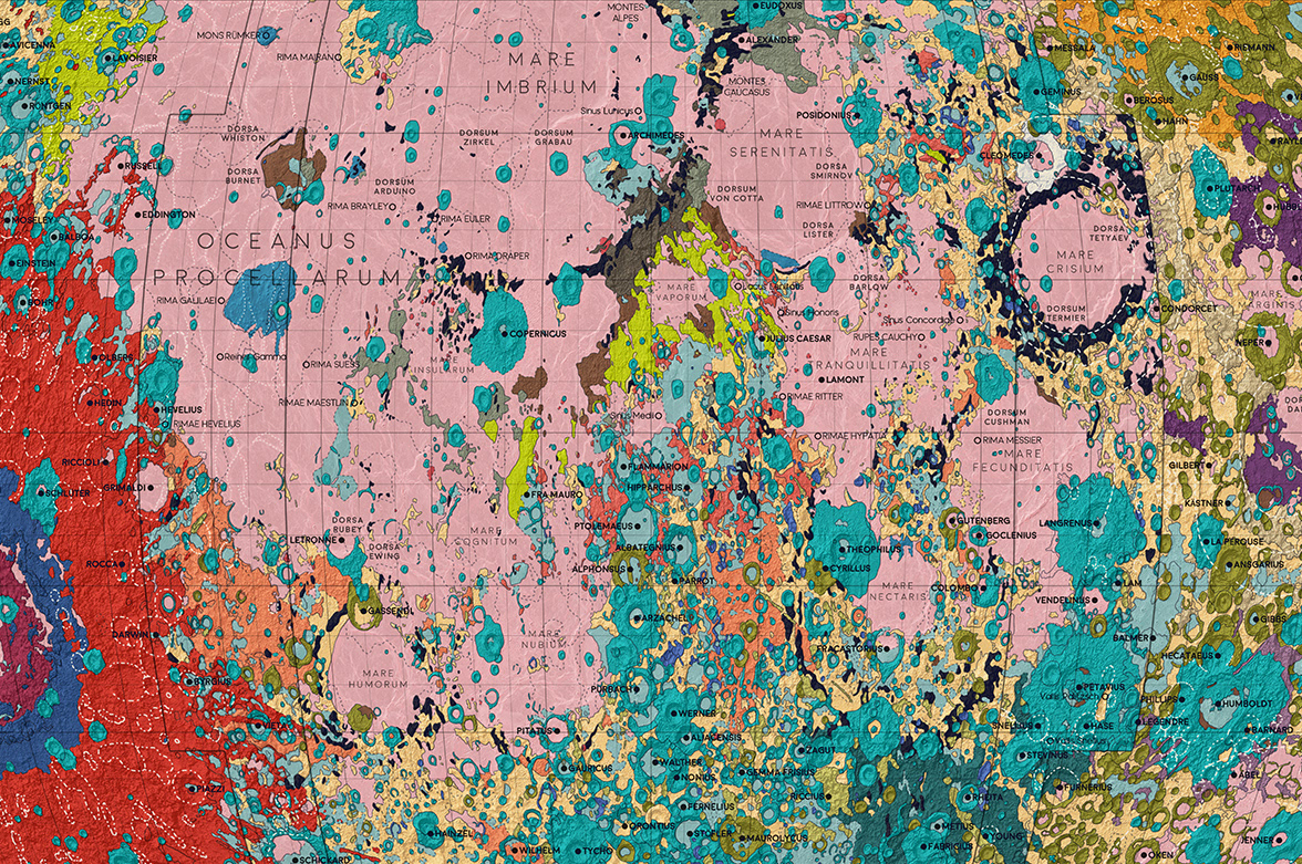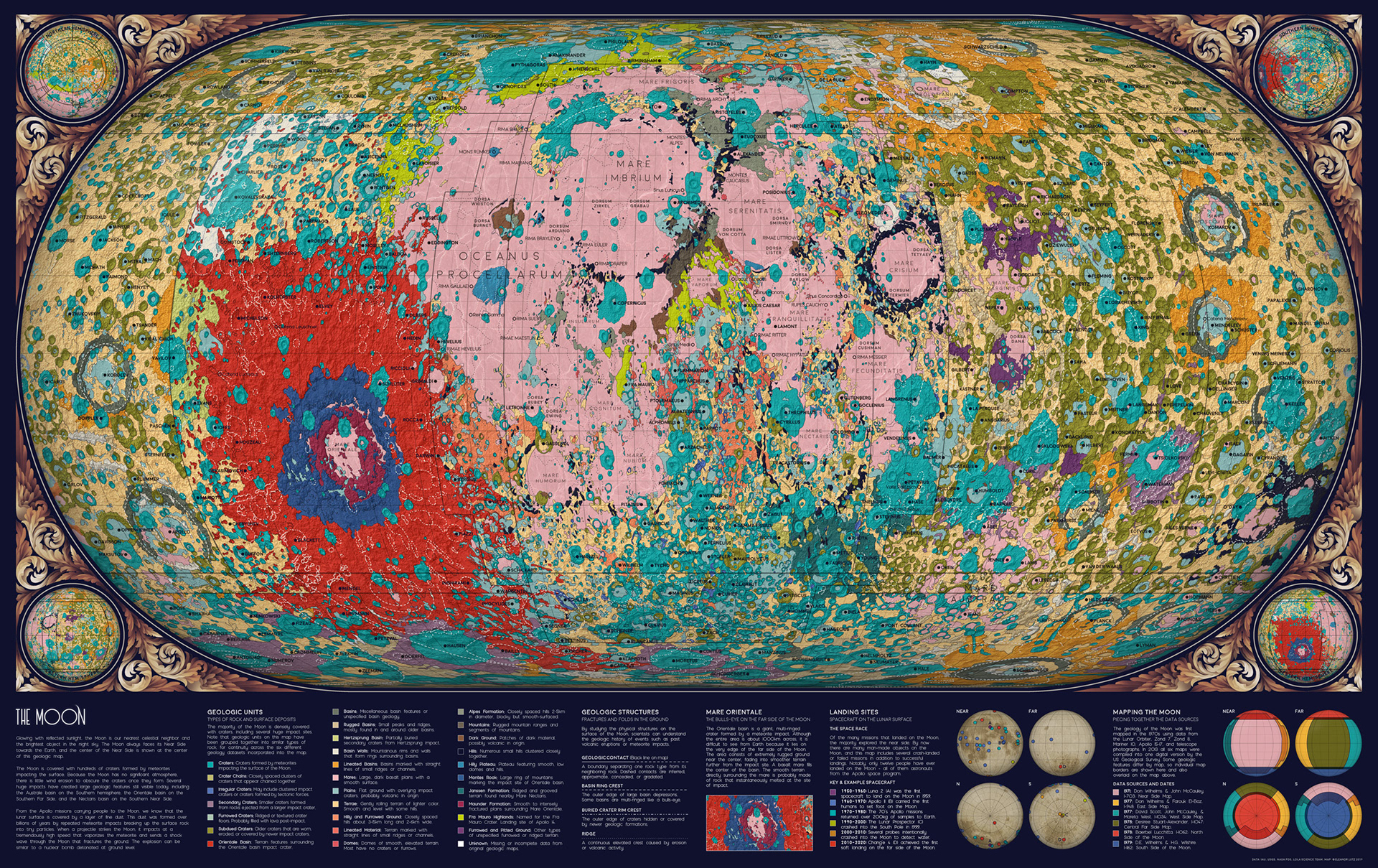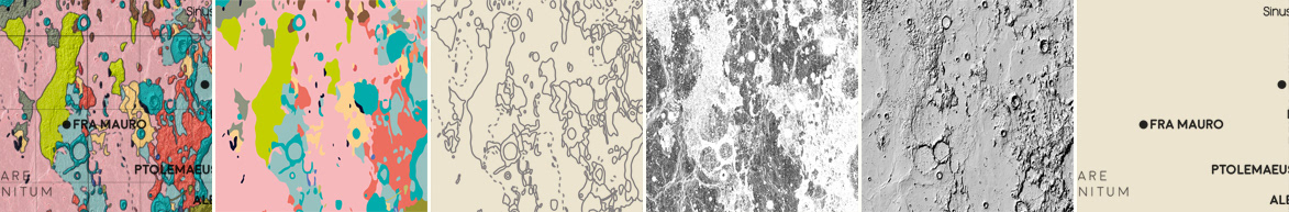 These two maps were intended for the general public, so I translated the scientific labels in the original USGS maps into more generic language. For the moon map, I also needed to merge six different geologic datasets, in addition to the Digital Elevation Model and the nomenclature labels.