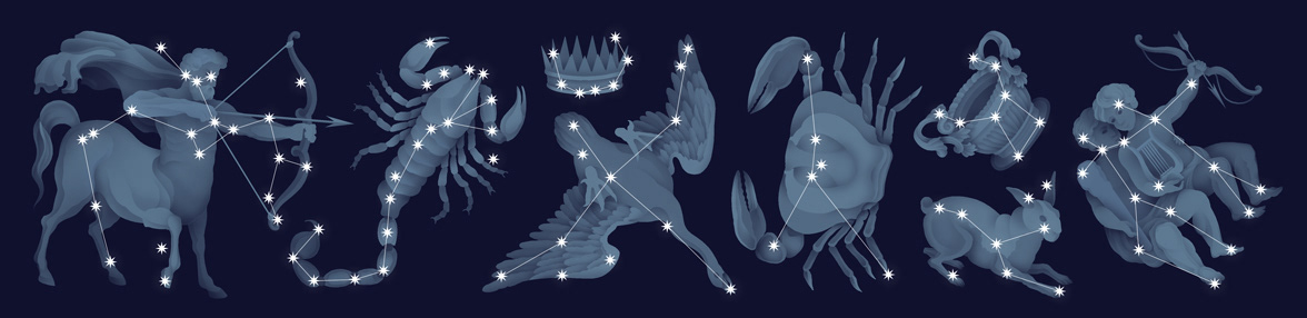 To illustrate the constellations shown on the bottom of the map, I used the 1824 card series "Urania’s Mirror" as a reference. To update these illustrations from Urania’s Mirror, I first mapped each constellation using the modern HYG star database. Then I adjusted pieces of the Urania’s Mirror illustrations to fit next to the modern star alignments. I also increased the contrast between shapes and removed some confusing details, like the quiver on the centaur’s back in this example.